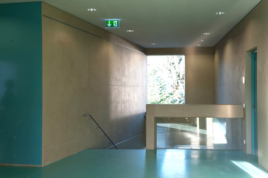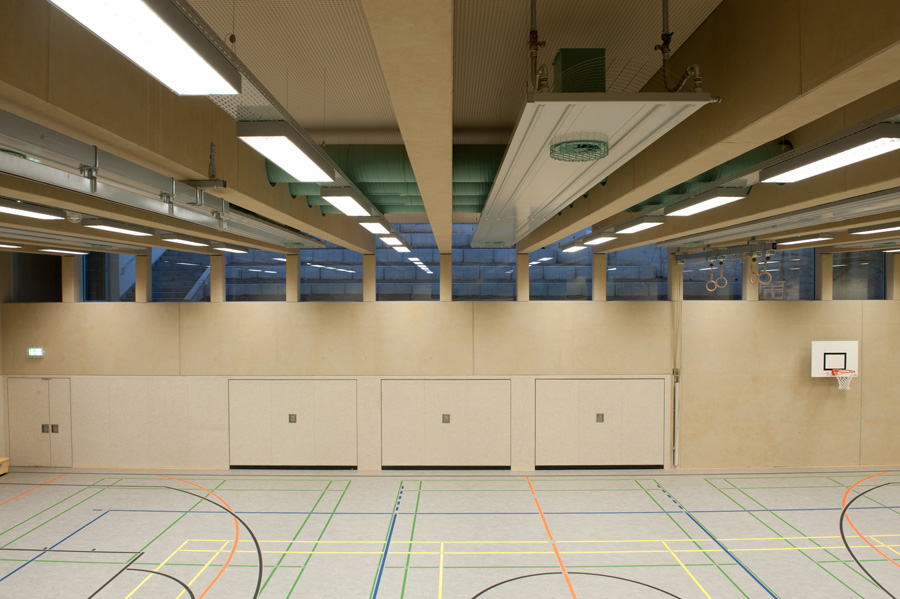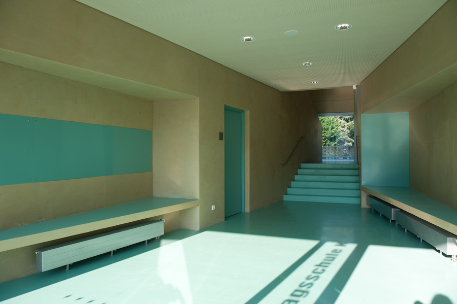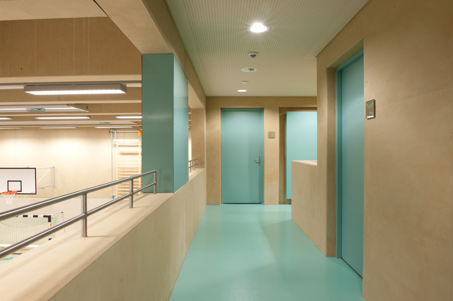 Hofseitig springt das Erdgeschoss zurück, sodass eine überdachte Eingangsfläche für die unterschiedlichen Nutzungen OGTS, Pausen-WCs und Turnhalle entsteht.