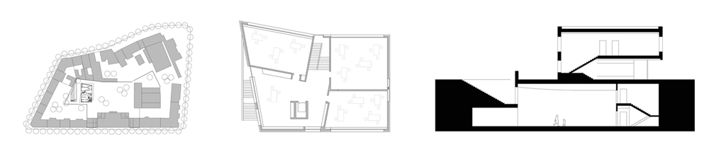 Der 2-geschoßige Neubau der Mensa wird im nord-östlichen Bereich des Schulgrundstückes als Pendant zur gegenüberliegenden alten Turnhalle positioniert. Im Zusammenspiel mit den bestehenden Schulgebäuden entsteht ein u-förmig gefasster Schulhof. Die Turnhalle ist unterhalb der Mensa vollständig unterirdisch angeordnet.