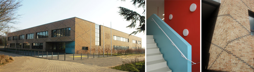 Die 2-geschossige Schule besteht aus einem 2-hüftigen Klassentrakt sowie einem einhüftigen Teil mit Verwaltung, WC-Bereichen und Hausmeisterwohnung.
