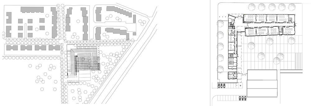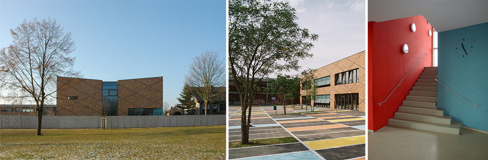 Die dreizügige Grundschule liegt am Rande eines heterogenen Wohngebietes in Köln-Zündorf. Der L-förmige Grundriss bildet einen eindeutigen Abschluss zur Wohnbebauung und schafft im Zusammenspiel mit der vorhandenen Turnhalle einen großzügigen gefassten Pausenhof. Dieser öffnet sich gegen Osten zu einem mit Obstbäumen bepflanzten Schulgarten.