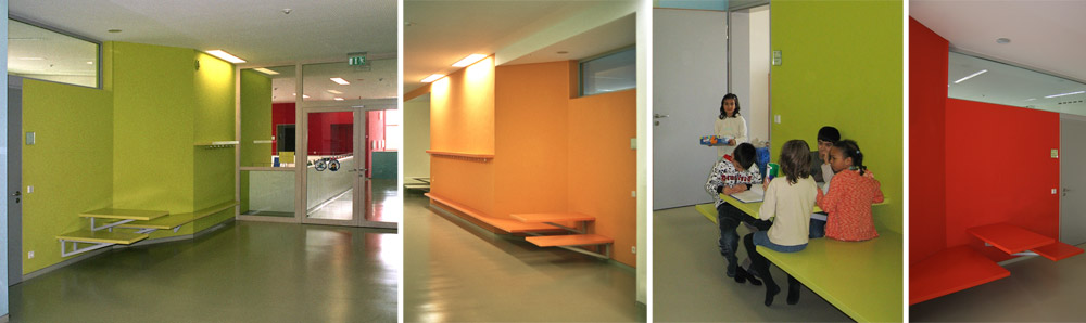 Der zentrale Flur der Klassengeschosse ist mit seinen farbig gefassten Sitznischen Teil der "Lernlandschaft" und schafft zusätzliche räumliche Angebote für die Schüler.