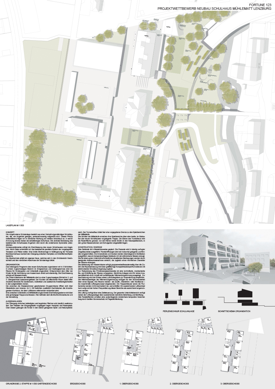 Die vorgefundene Schulanlage besteht aus einer Vielzahl eigenständiger Schulhäuser, die, am Angelrain gelegen, perlenschnurartig aufgereiht sind. Dieses Prinzip weiterführend fügen wir in nördlicher Richtung ein weiteres Schulhaus an, in seiner Anmutung ebenso lesbar als selbständiges Schulhaus. Die zentrale Bedeutung des bestehenden Schulhauses Angelrain wird durch die entstehende Symmetrie unterstrichen. Konsequenterweise erfolgt die Erschliessung des neuen Schulhauses vom Angelrain. Nach Osten entwickeln wir das bestehende parallele System der vorgelagerten Terrassen und Plätze weiter. Eine breite Stufenanlage in Verlängerung der Terrasse Bezirksschulhaus markiert den Übergang zwischen Hartplatz und Grünflächen/Spielbereiche.