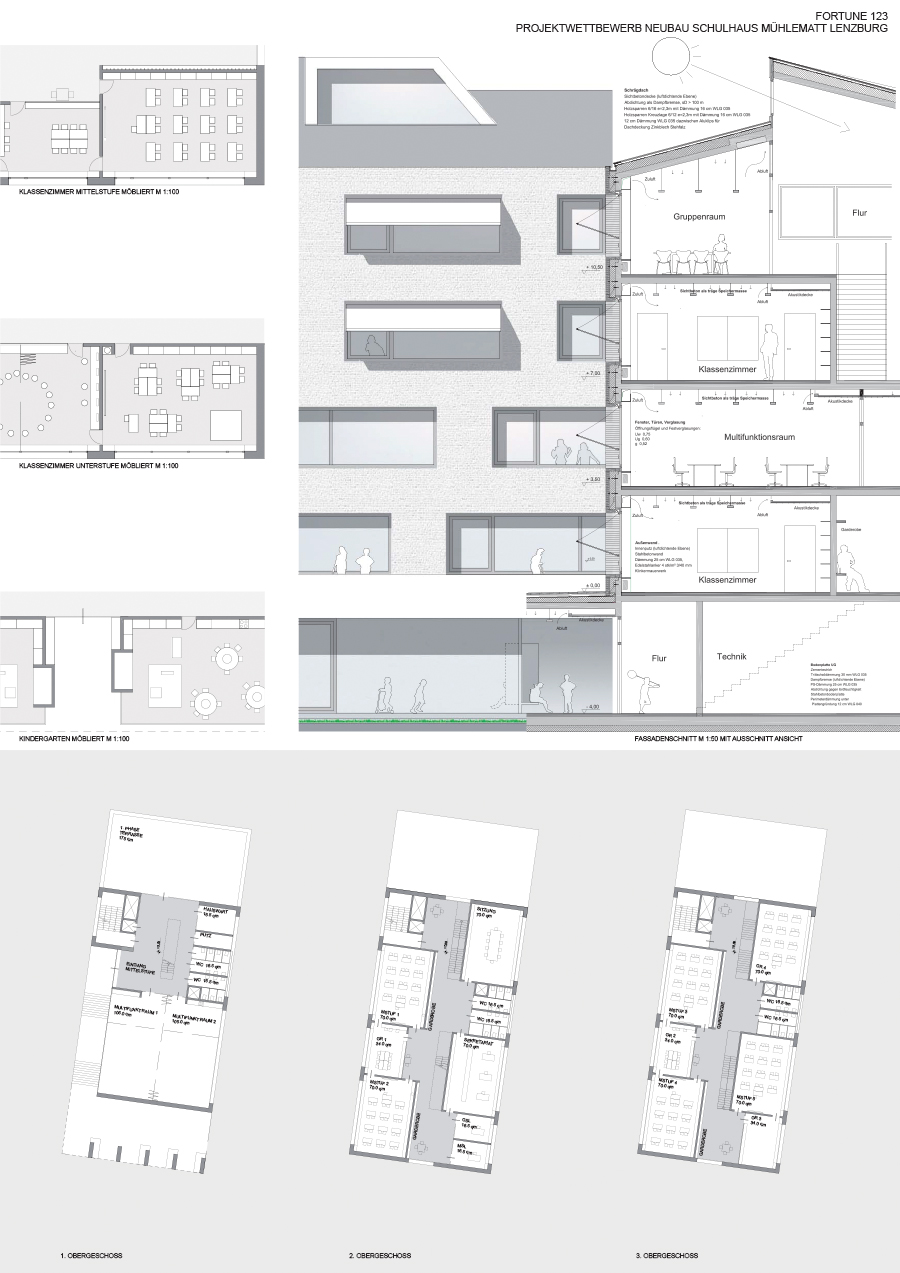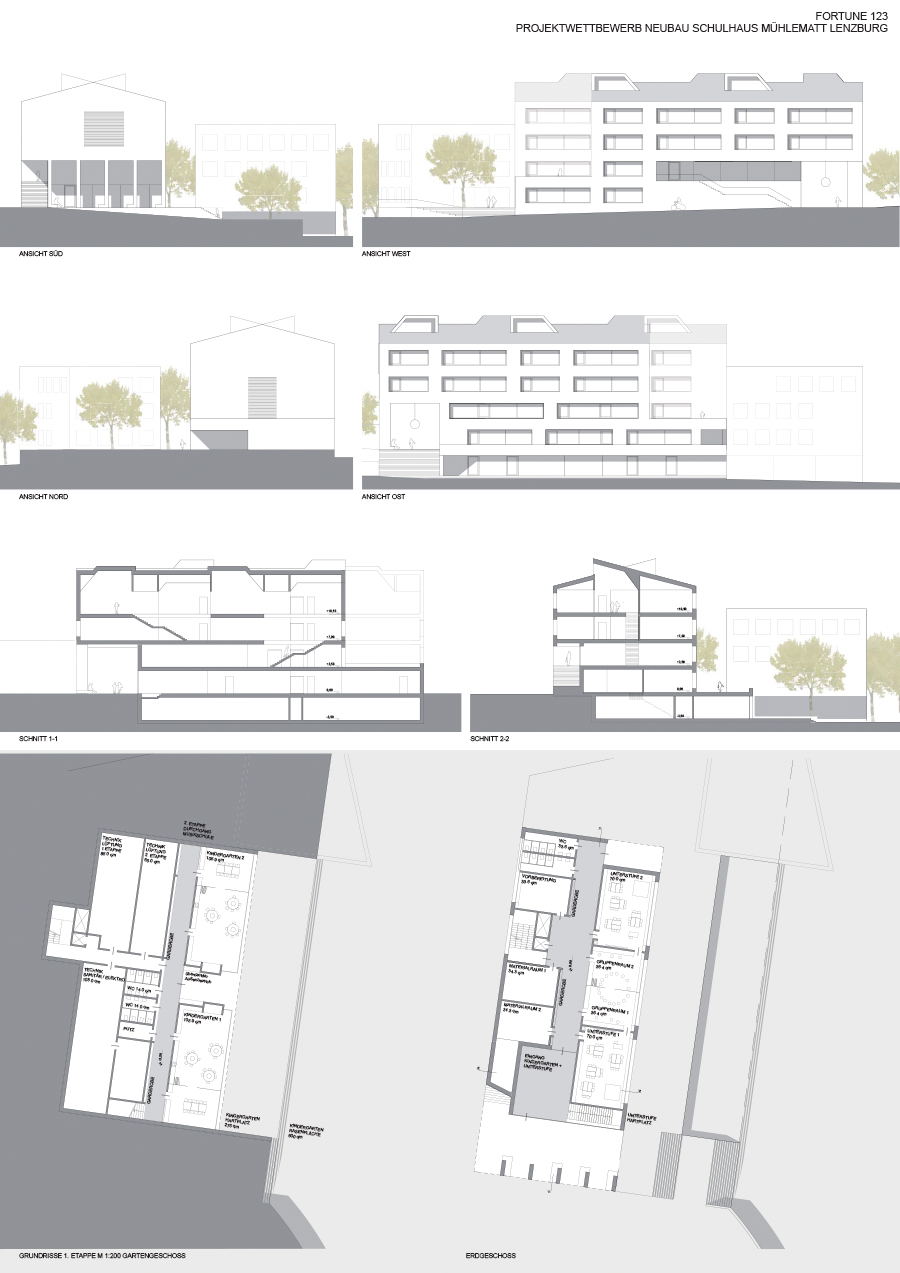 Das heterogene Programm des neuen Schulhauses organisieren wir in 3 Schichten: In einem 2-geschossigen Bereich im Erdgeschoss und Gartengeschoss sind die Räume für Kindergarten und Unterstufe angeordnet. Entsprechend dem Alter der Kinder ist die Verbindung zum Aussenraum direkt und ebenerdig. Die Erschliessung erfolgt auf Strassenniveau.