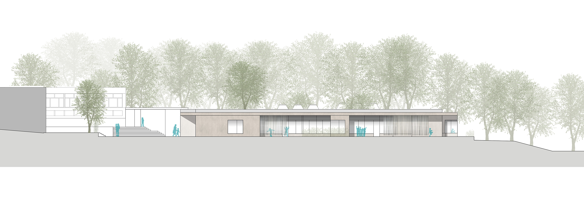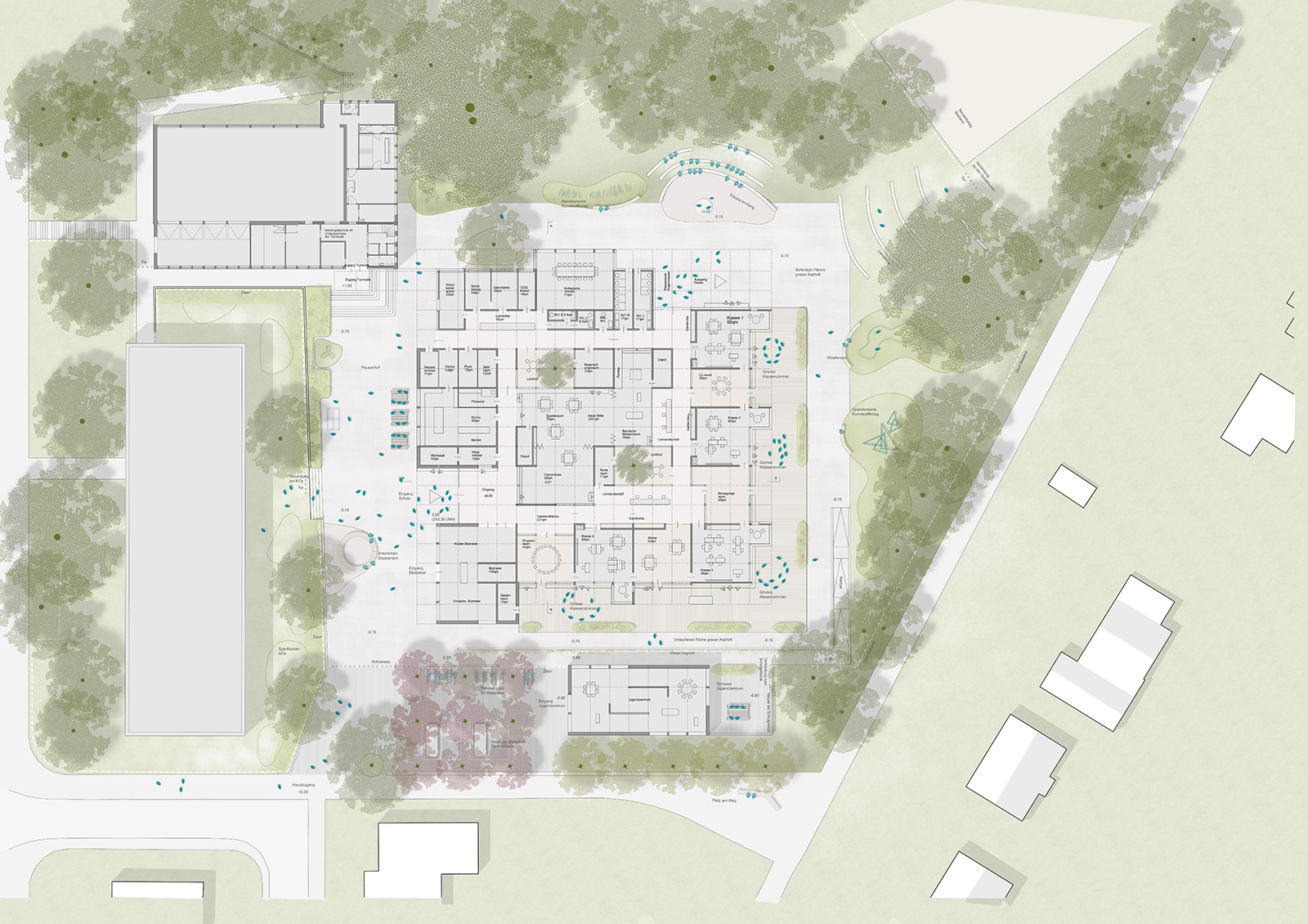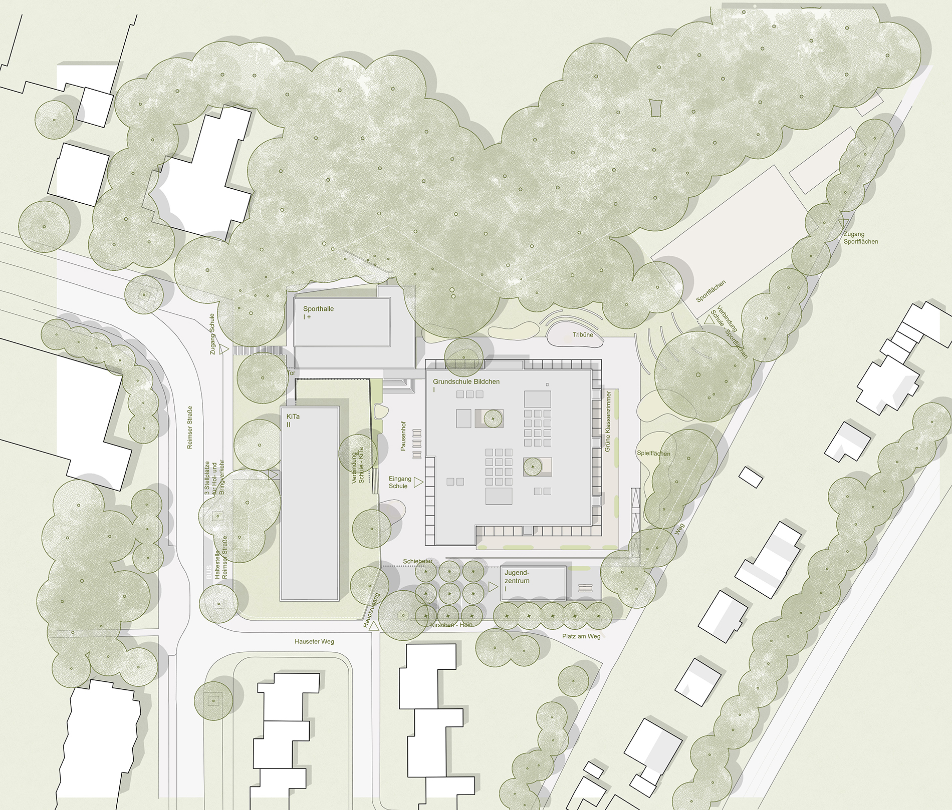 Ein Neubau für die KGS Bildchen schafft die Möglichkeit, die vielen wichtigen Mitspieler an diesem Ort zu einem starken Ensemble zusammen zu bringen, das altersübergreifend eine Bildungsheimat der Kinder in Aachen Preuswald bildet. Diesem Gedanken folgend schlagen wir die Schaffung eines Campus vor: Die neue Schule, Bibliothek, Jugendzentrum und Kindergarten gruppieren sich um einen neu geschaffenen zentralen Platz mit eindeutiger Adressbildung am Hauseter Weg. Die Bestandsbauten werden konzeptionell einbezogen und das neue Schulhaus zum integrativen Bestandteilen des Ensembles.