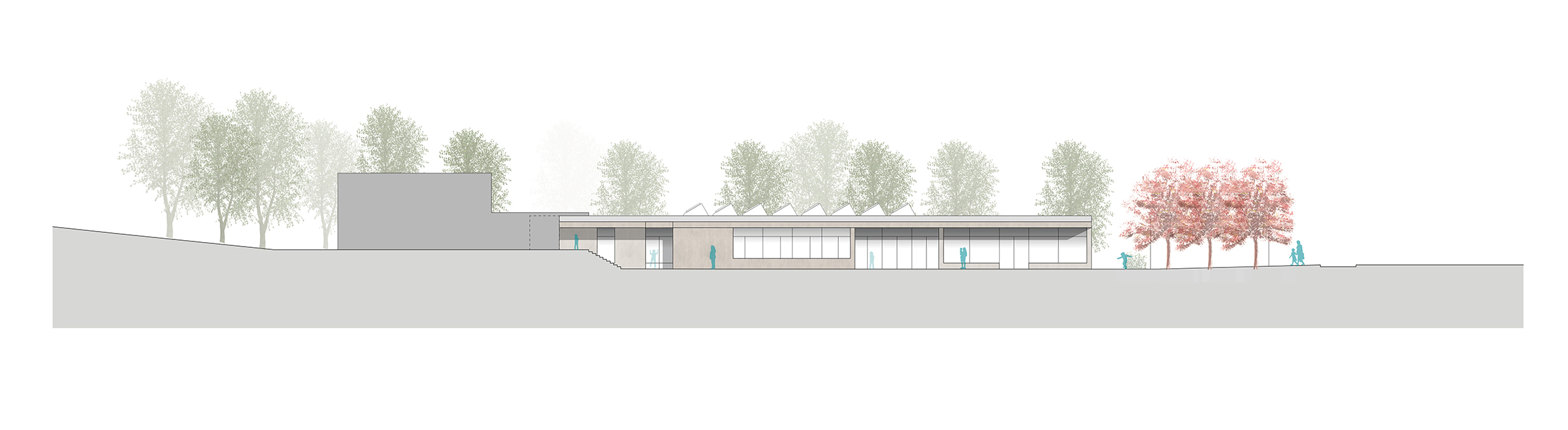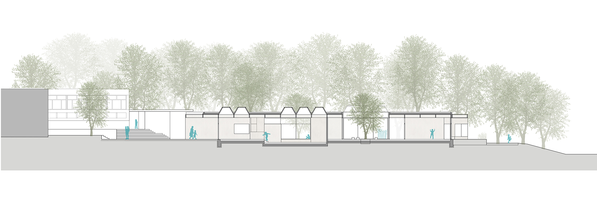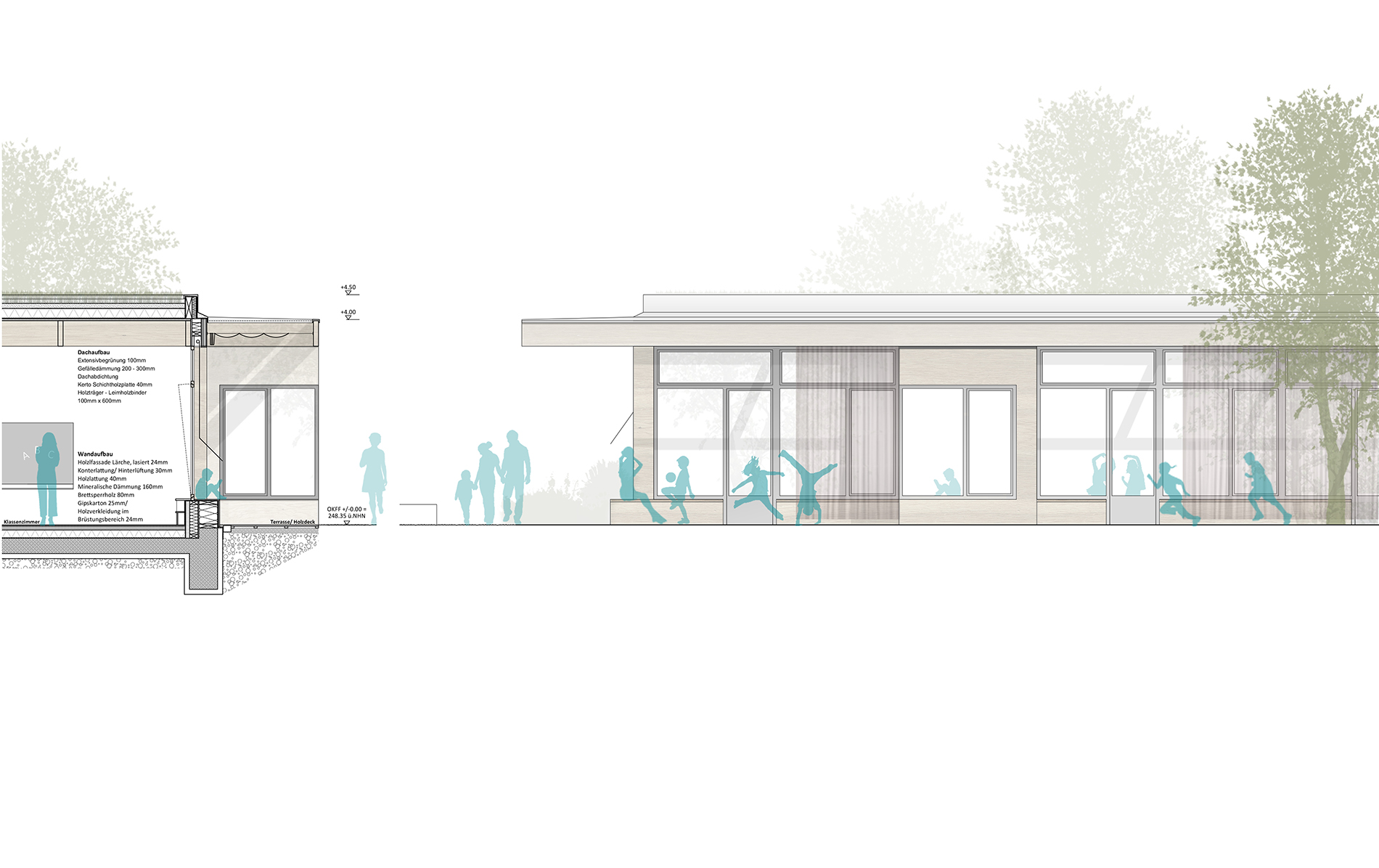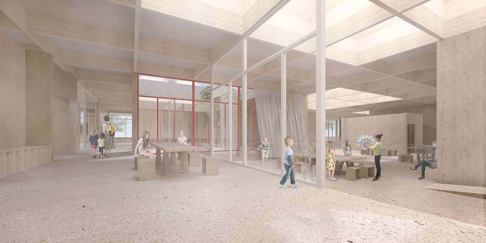 Die zentralen gemeinschaftlichen Nutzungen der Schule bilden einen einladenden, hellen Raum, das „Herz“ der Schule, um das sich Klassen- und Gruppenräume, Verwaltung und Küche auf differenzierte Weise gruppieren. Ein großzügiges Dach überspannt alle Lernräume und die direkt angrenzenden grünen Klassenzimmer es vermittelt zum einen die Bedeutung aller Einzelteile als auch das gemeinschaftliche Ganze.