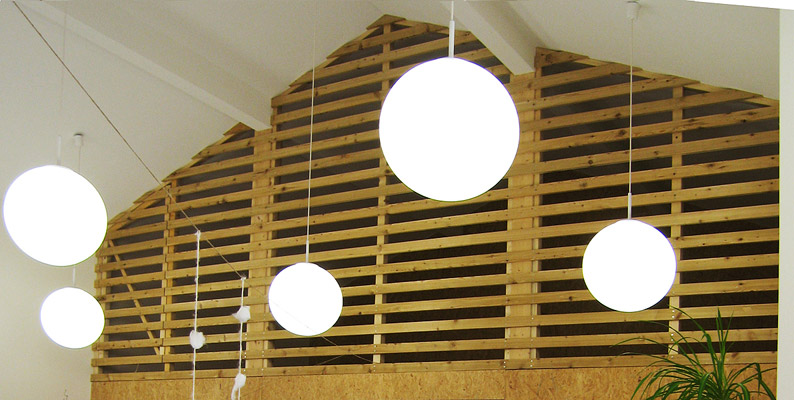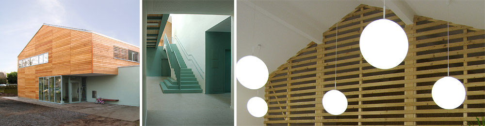 Unter einem schützenden Dach sind Räume für eine integrative Kindertagesstätte mit 3 Gruppen sowie die Verwaltung des Trägers untergebracht. Die Gruppenräume sind auf 2 Ebenen auf der rückwärtigen ruhigen Gartenseite um eine zentrale, 2-geschossige Halle angeordnet. Alle Gruppen haben direkte Anbindung an den Garten.