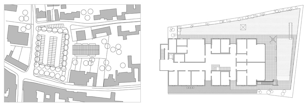 Das geplante Haus für den Verein "miteinander leben e.V." schafft mit seiner Öffentlichkeit und der zentralen Lage in "erster Reihe" am Platz neue Perspektiven und Synergien. Der kompakte 2-geschossige Baukörper nutzt die volle Tiefe des Grundstückes.