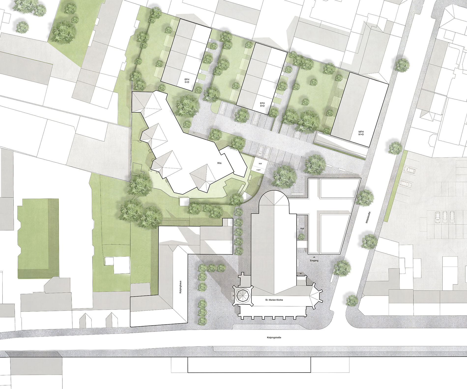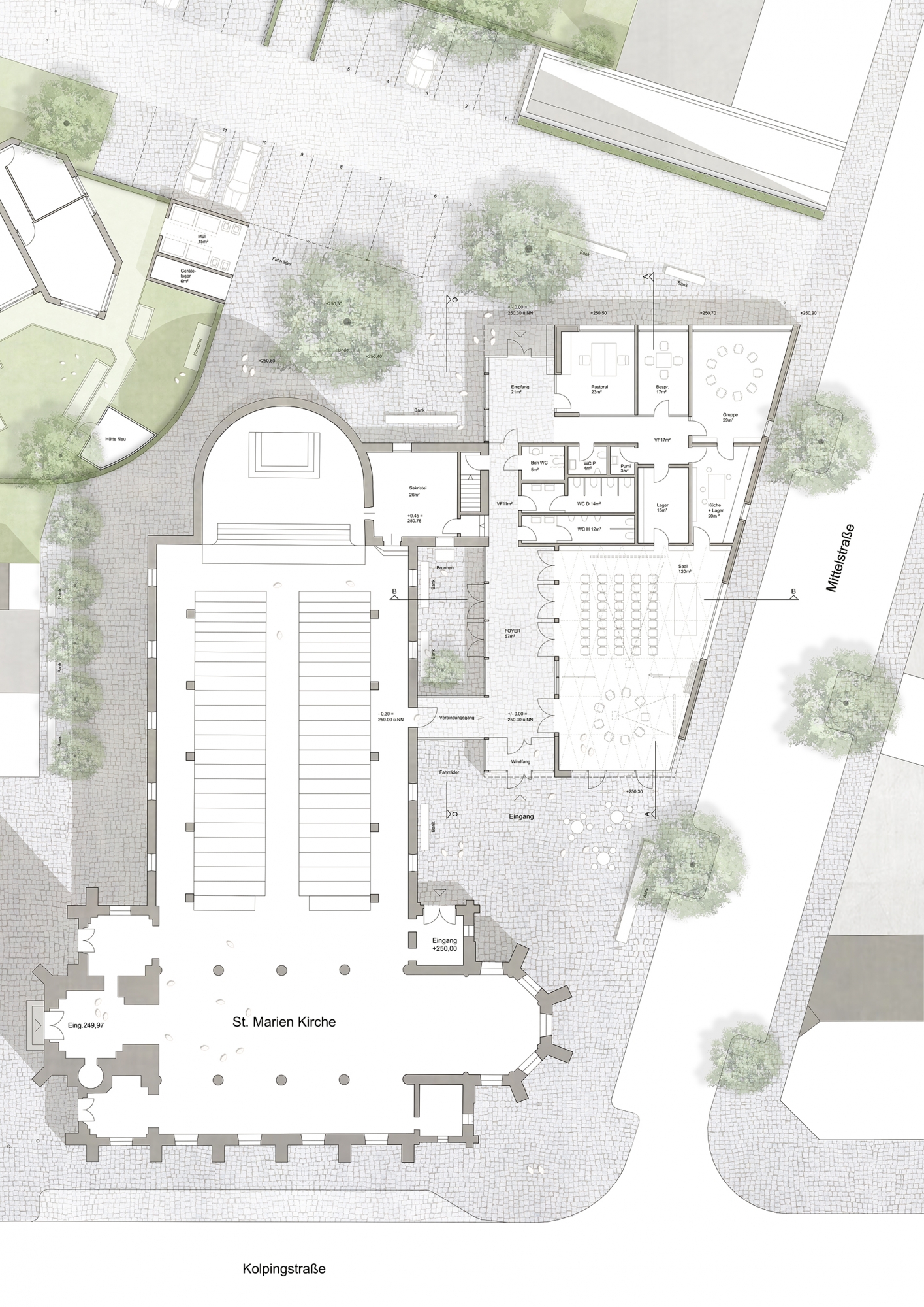 Der Kirchenbau ist umgeben von einer Abfolge differenzierter Außenräume und Begegnungsorten, von welchen die verschiedenen kirchlichen Einrichtungen erschlossen und untereinander verbunden werden. Der Baukörper des Pfarrheims bezieht sich in Lage, Geometrie und Gebäudehöhe auf den Kirchenbau. Er hält Abstand zu den Kirchenfenstern des Erweiterungsbaus, ist an diesen jedoch durch die bestehende Sakristei angebunden. Zwischen Kirchen- und Gemeinderaum entsteht ein Innenhof, der gleichzeitig als Erweiterung des anschließenden Foyers genutzt werden kann.