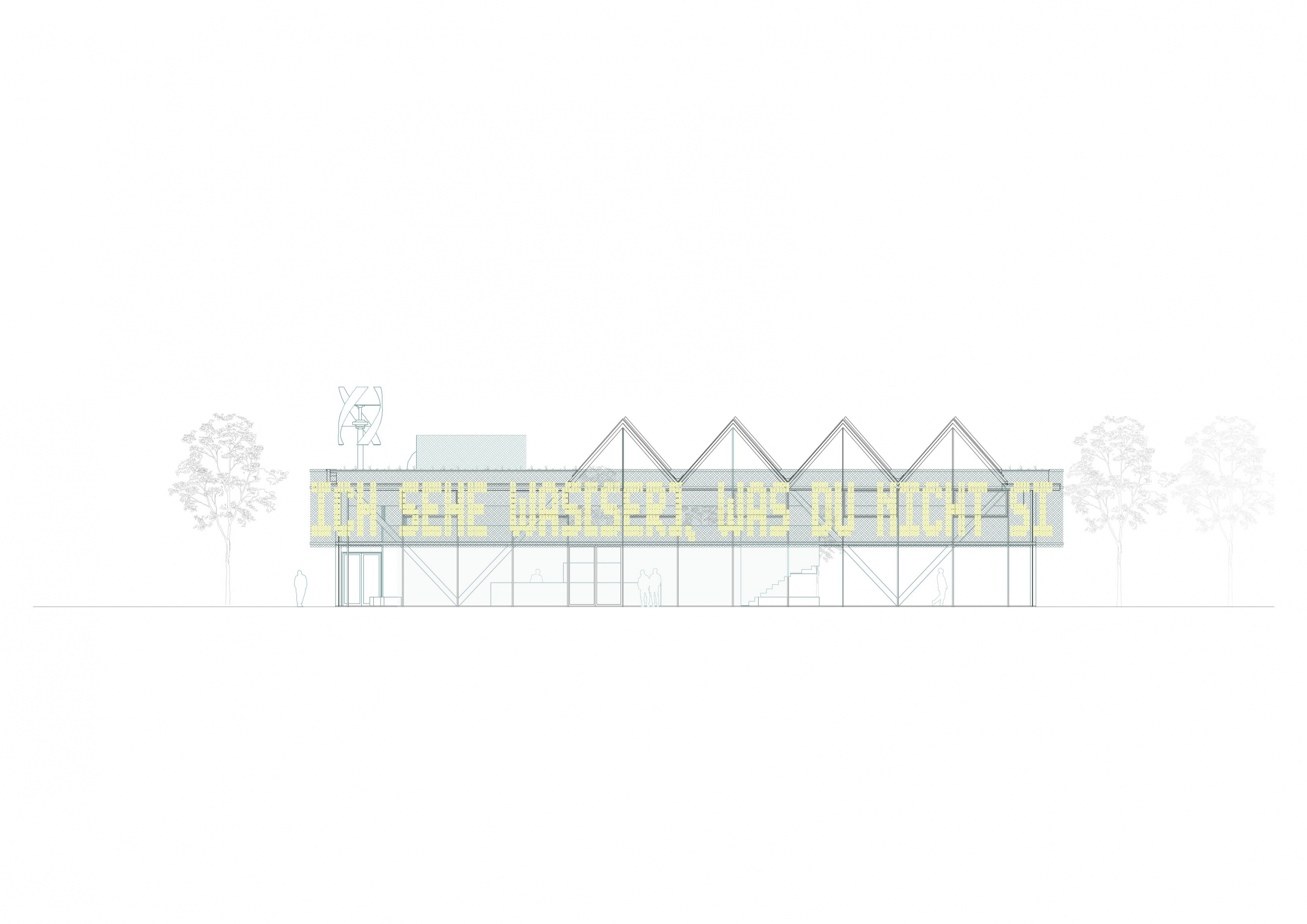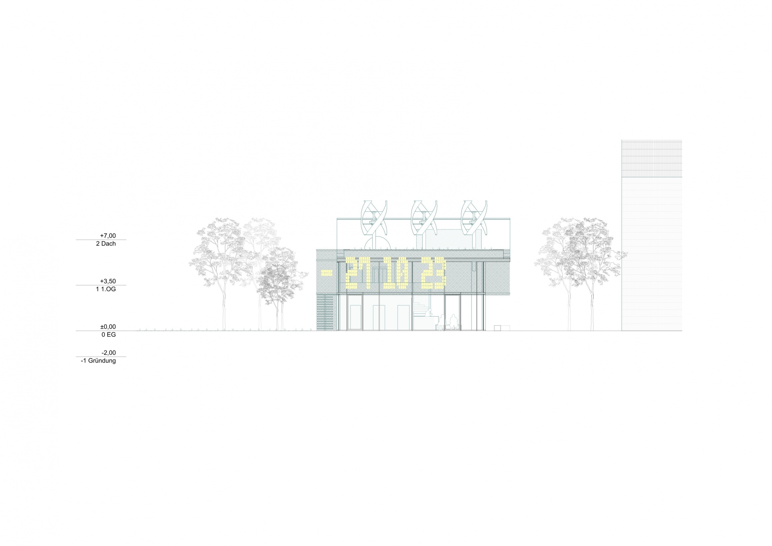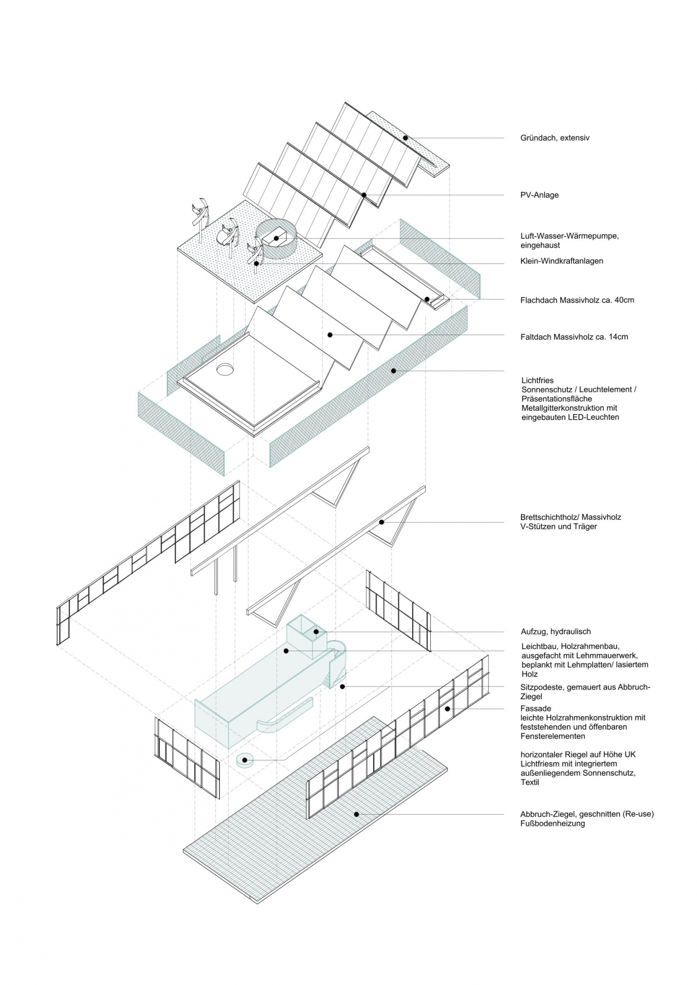 Dieses Konzept greifen wir auf und erweitern das Ensemble um ein weiteres skulpturales „Spiel“-Objekt. Eine aufgeständerte gefaltete Dachlandschaft wird zum Demonstrator unterschiedlicher technologischer Objekte, die durch die Nutzung von Sonne, Wind und Luft Energie erzeugen.