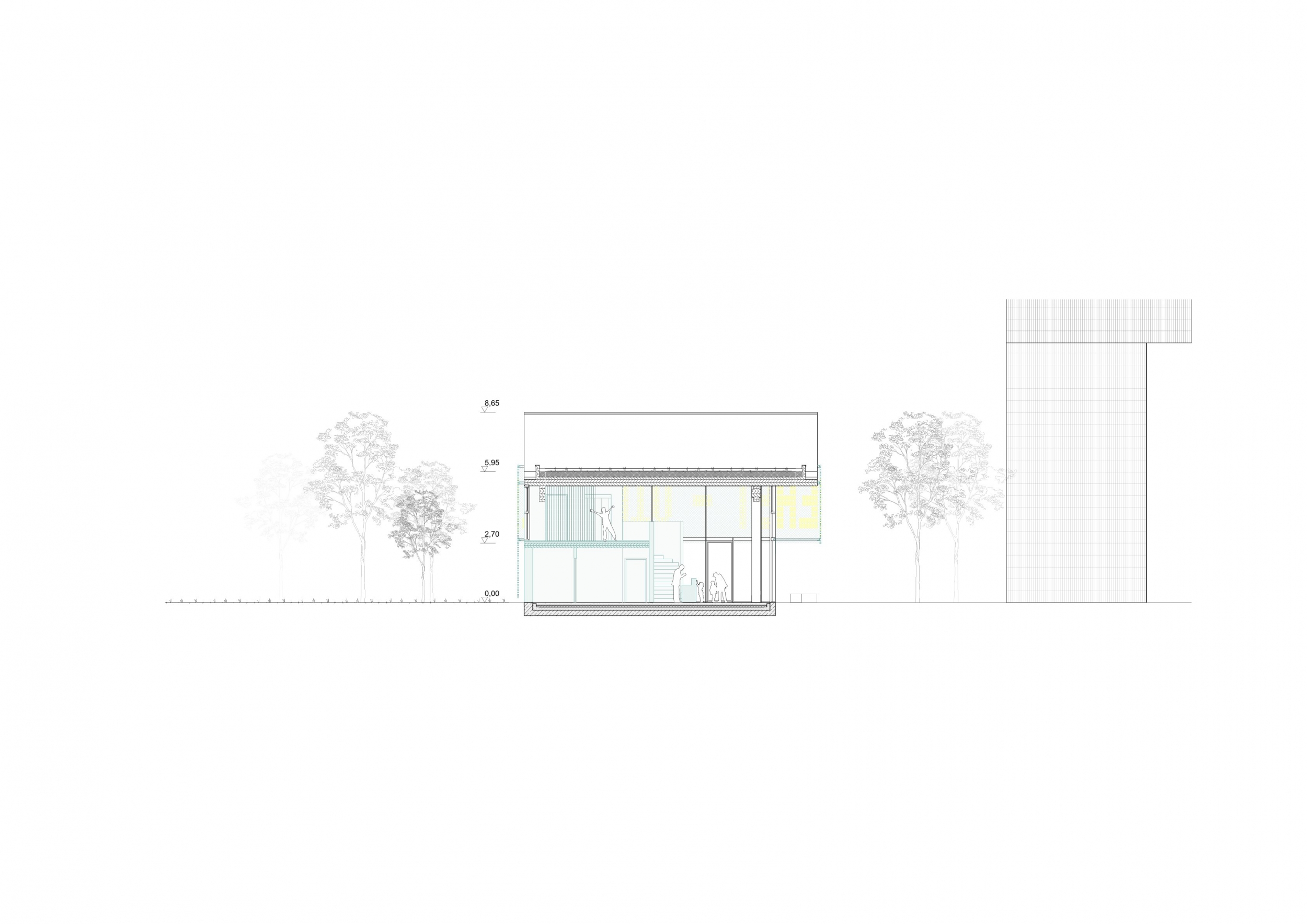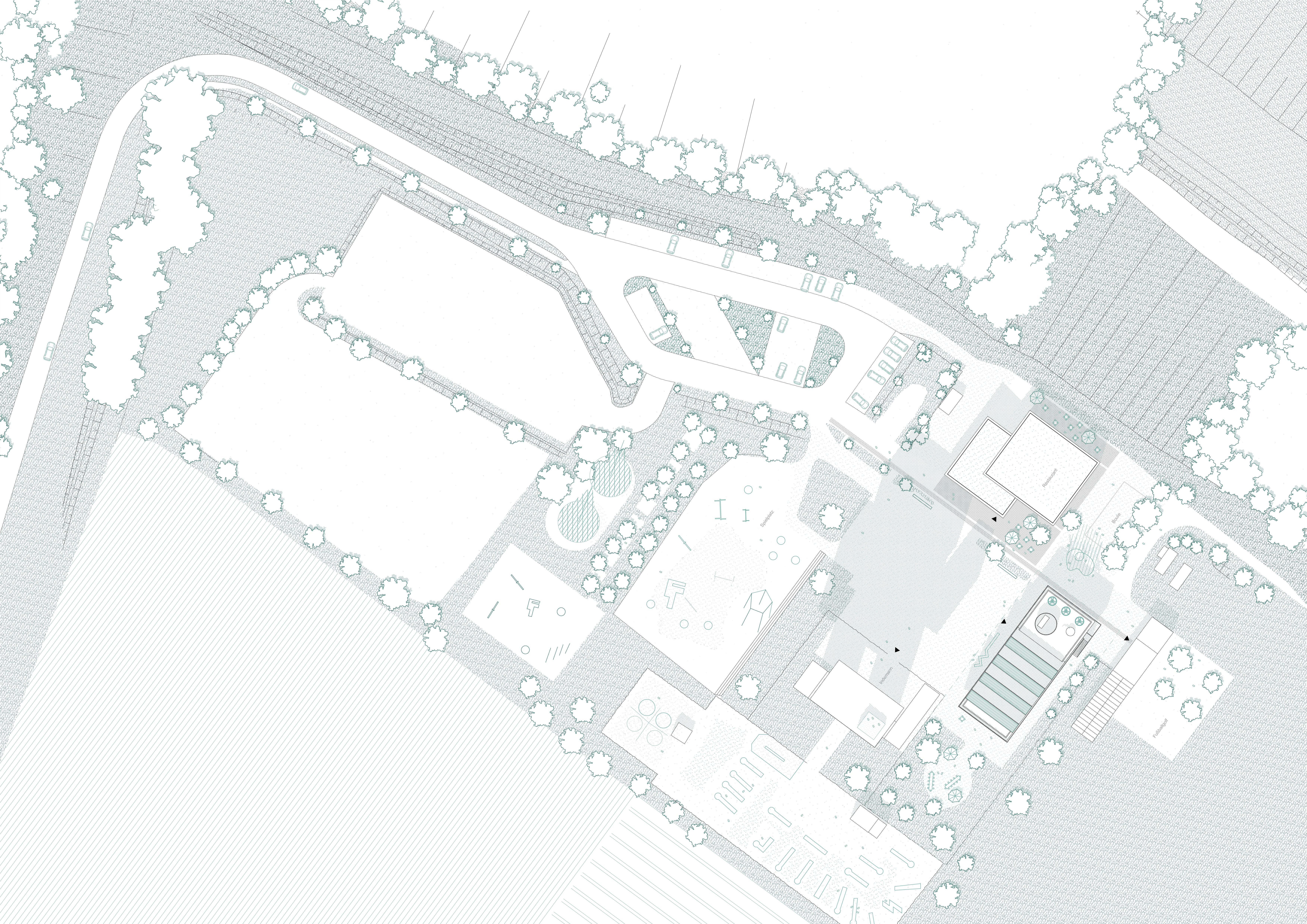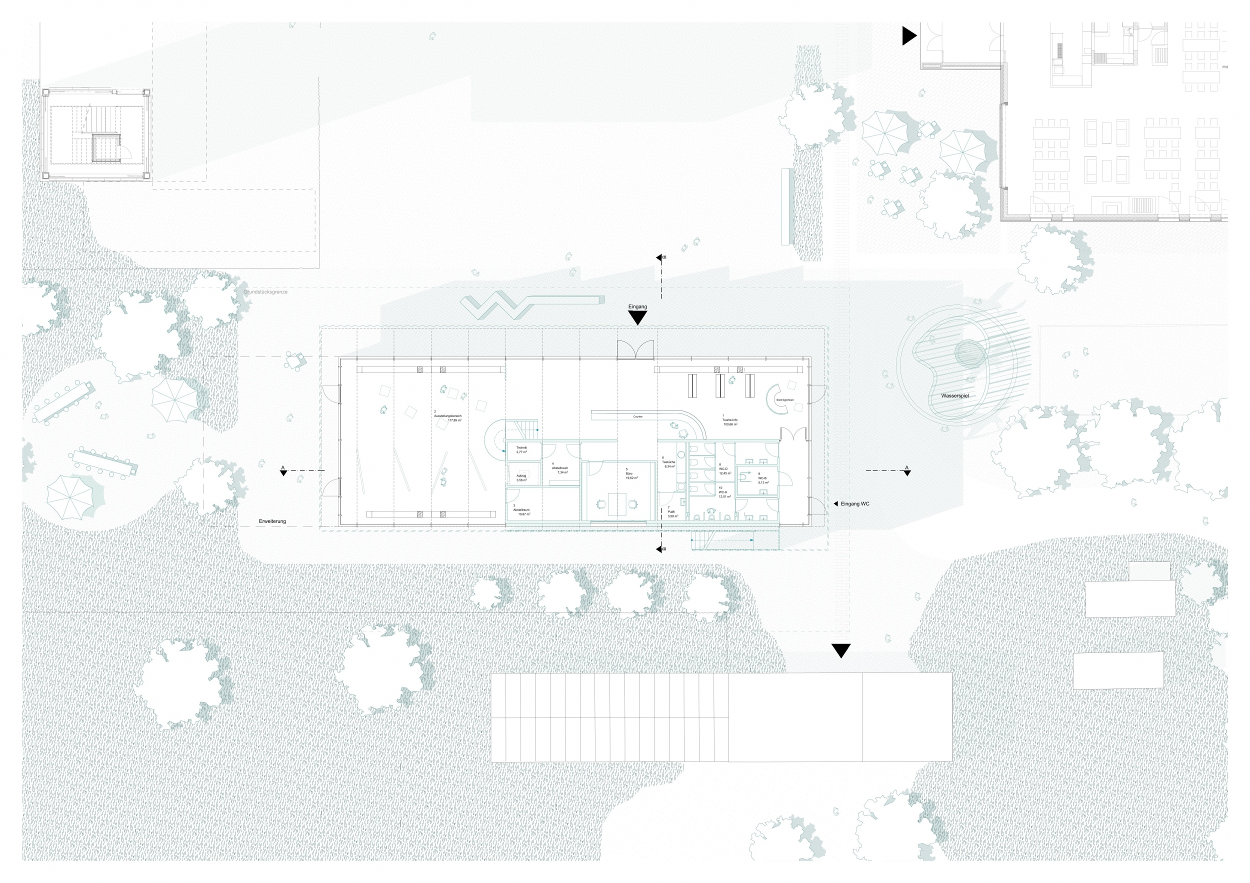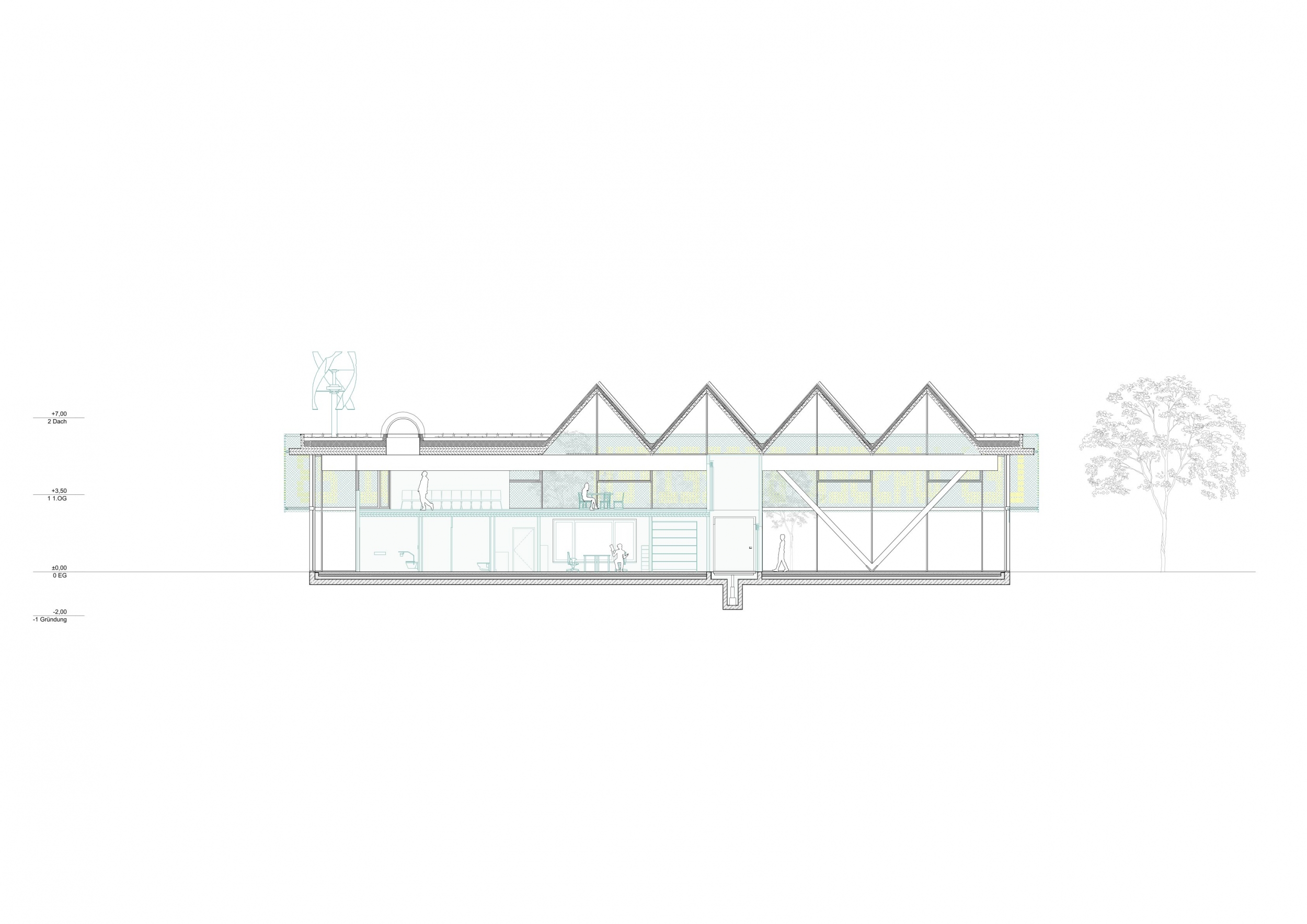 Dieses Konzept greifen wir auf und erweitern das Ensemble um ein weiteres skulpturales „Spiel“-Objekt. Eine aufgeständerte gefaltete Dachlandschaft wird zum Demonstrator unterschiedlicher technologischer Objekte, die durch die Nutzung von Sonne, Wind und Luft Energie erzeugen.