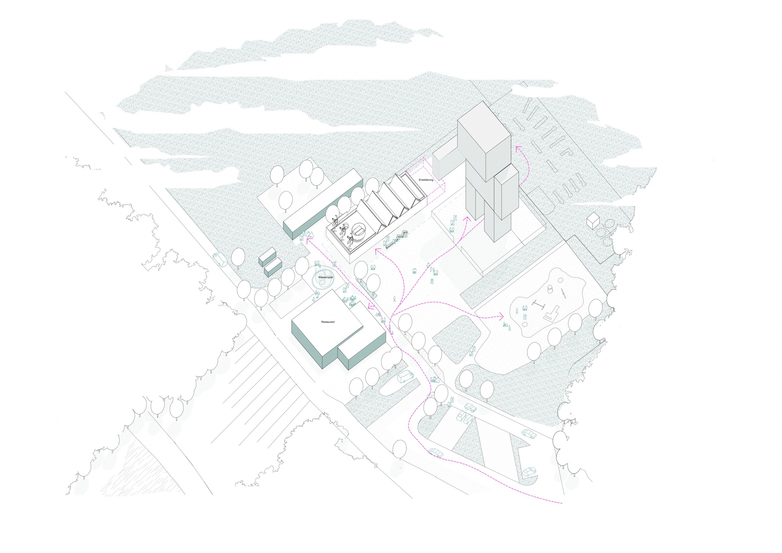 Die vorgefundene Situation auf der Goltsteinkippe ist auf vielfältige Art geprägt durch das Thema Spiel – in Form unterschiedlicher Freizeit- und Spielplätze wie auch der Ausbildung des Aussichtsturmes in Anlehnung an eine digitale Spielfigur.