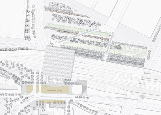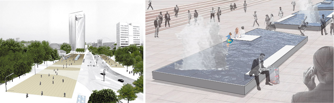 Der Platz wird als angemessen großzügiges Entré für den ankommenden Reisenden verstanden. Die klare Platzgeometrie ermöglicht Orientierung und verknüpft den Platz mit den angrenzenden Nutzungen. Durch Verdichten der Bäume werden die Platzränder gestärkt. Die Platzfläche selber wird freigehalten für offene Nutzungsangebote. Lediglich eine linear gegliederte Wasserschale, verstanden als symbolische einladende Geste , bietet einen Ort zum Warten, Treffen und Aufenthalt.