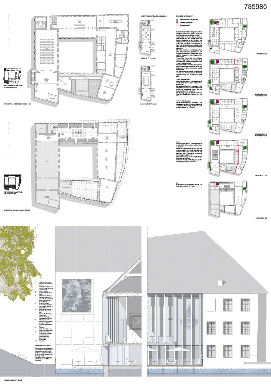 Dem Südflügel, mit seiner besonderen Lage zwischen Innenhof und Aufgang zum Domberg, kommt eine Schlüsselstellung zu: Wir erhalten seine Kubatur, die Dachkonstruktion und die Hoffassade mit der erdgeschossigen Arkade, ersetzen jedoch die kleinteilige geschlossene Raumstruktur durch eine 3-geschossige Loggia, in die einzelne Volumen für Museum und Nebenbühne eingehängt sind. Besonders das Restaurant im Erdgeschoss und das Museum im 1. Obergeschoss profitieren von großzügigen Lufträumen und Sichtverbindungen über mehrere Geschosse hinweg.