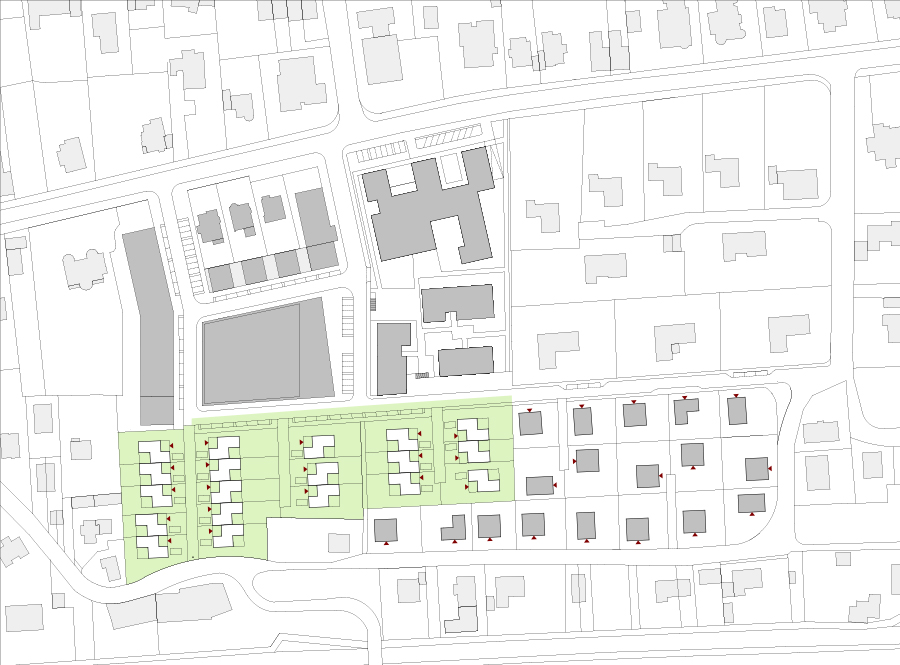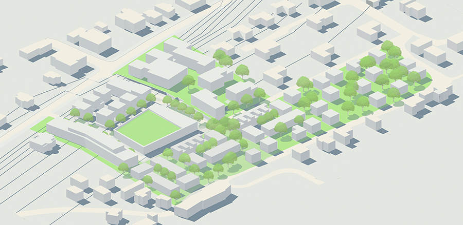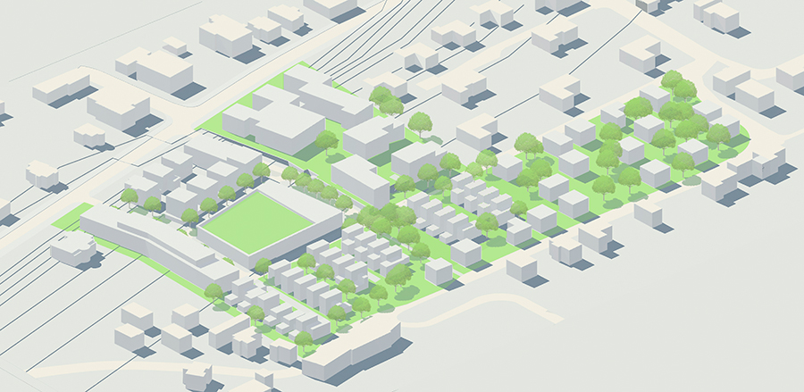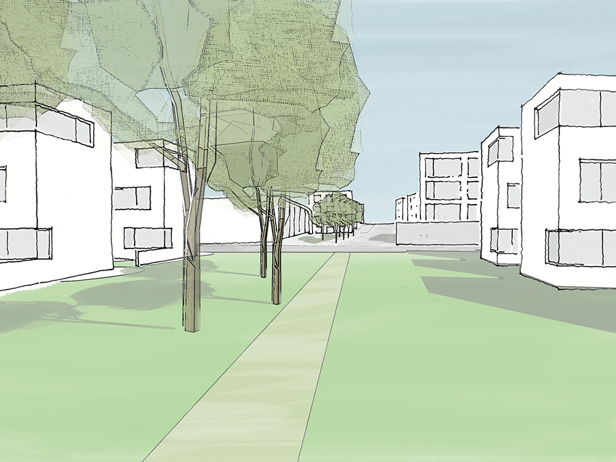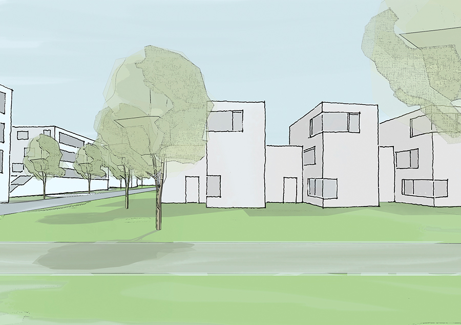 Das städtebauliche Konzept sieht eine Verdichtung des Gebietes mit weitgehender Wohnnutzung vor. Unterschiedliche Wohntypologien entwickeln sich aus der genauen Analyse der angrenzenden vorhandenen Wohnbebauungen.